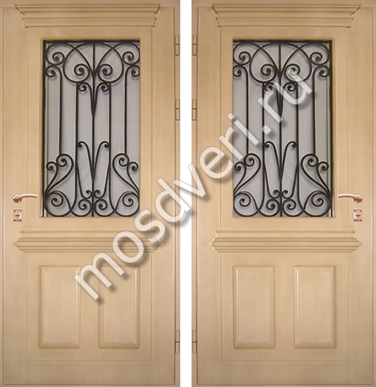 Входная дверь в коттедж из светлого массива со стеклом и ковкой — купите прямо сейчас! Позвоните нам, и узнайте точную цену уже сегодня. Выезд специалиста — по вашему графику!