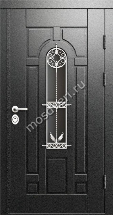 Темная входная дверь со стеклом и ковкой — совмещает стильный внешний вид и максимальную защиту.